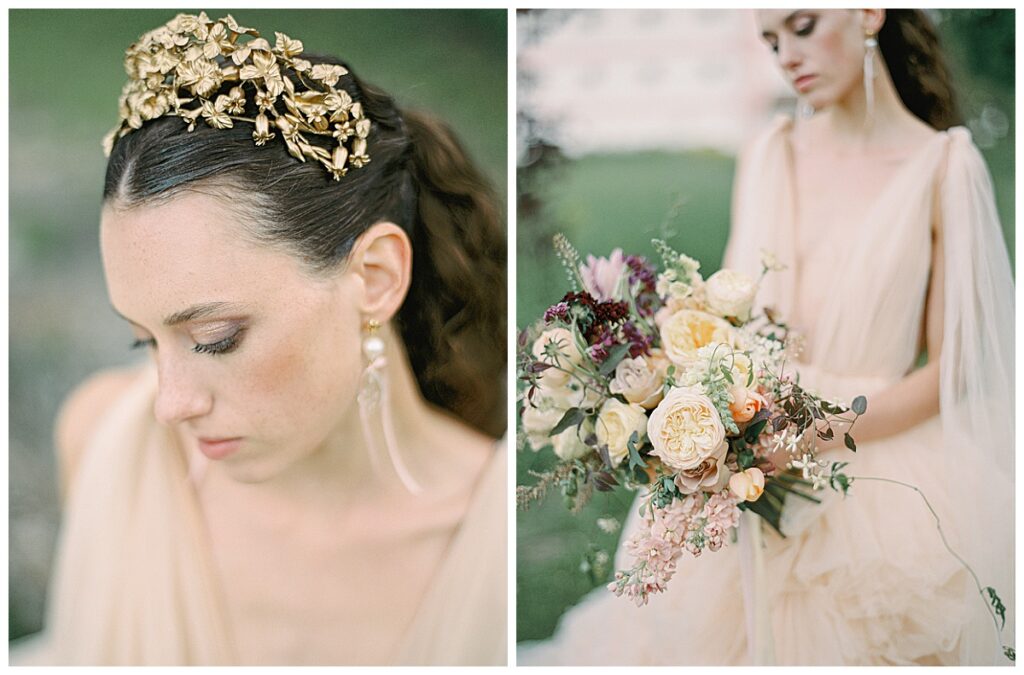 Im barocken Gartensaal von Schloss Harmannsdorf entstand ein poetisches Hochzeitsshooting, das historische Malereien mit moderner Hochzeitsästhetik verband.